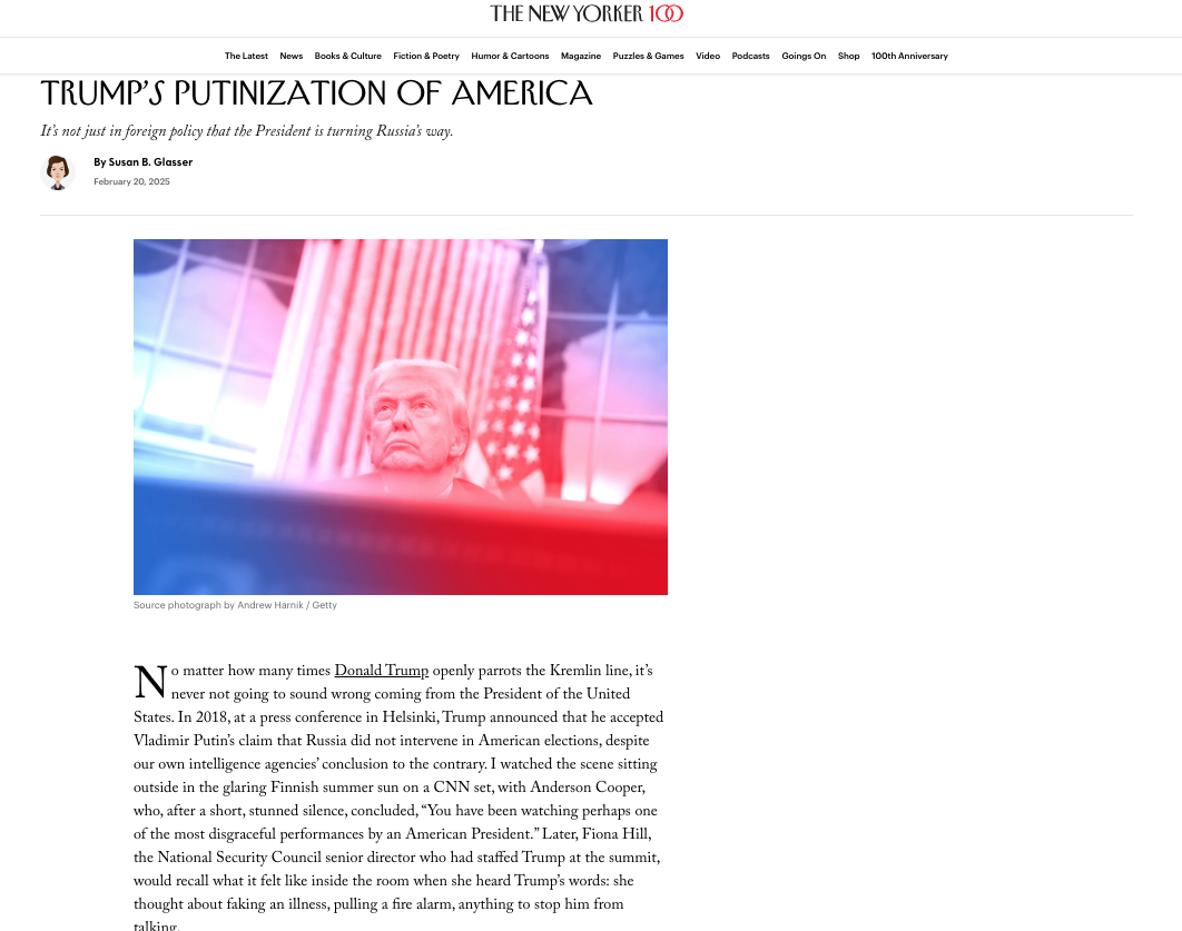 Відчайдушно сміливий у нинішніх умовах заголовок New Yorker «Трампівська путінізація Америки». Скрін newyorker.com