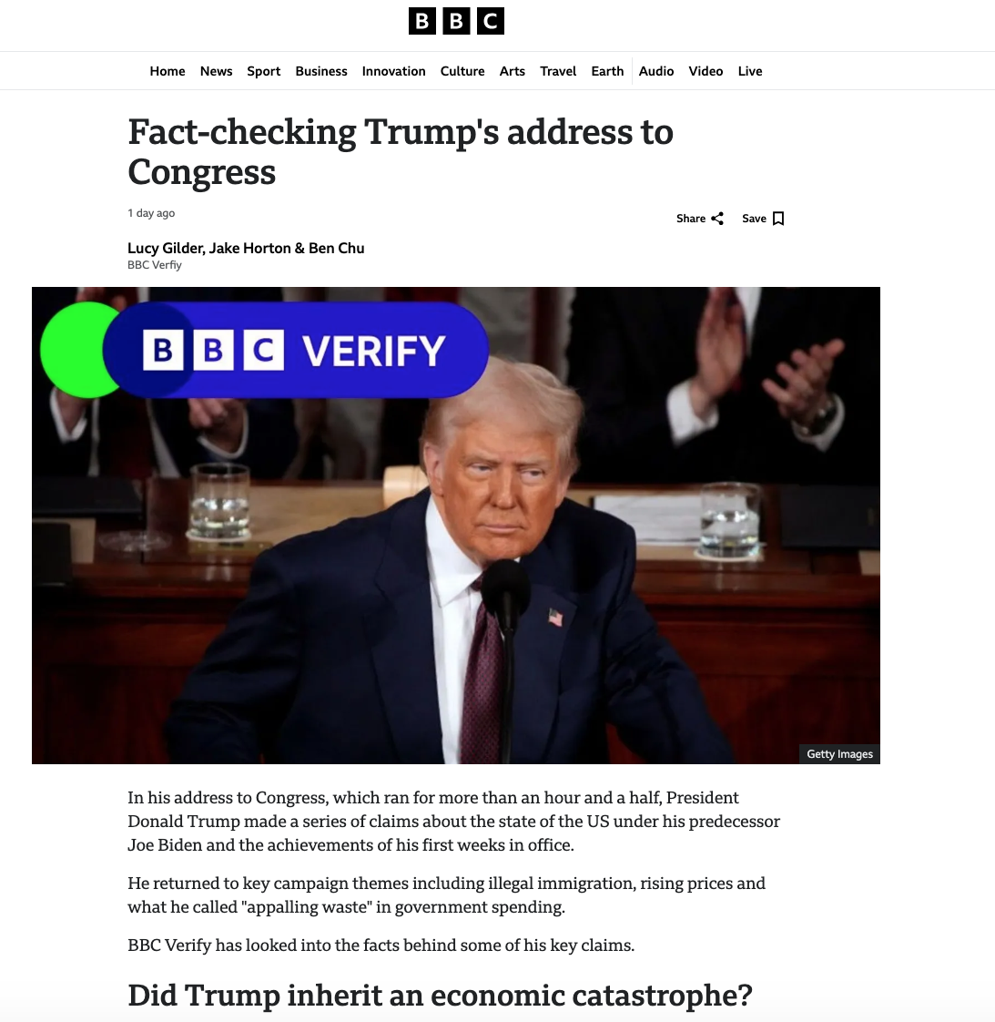 «Трамп заявив, що успадкував від Байдена «економічну катастрофу». Це помилка. Економіка США зростала на 2,3% у річному вирахуванні в останньому кварталі 2024 року за попередньої адміністрації… Говорячи про зростання цін, Трамп додав: «Ми пережили найсильнішу інфляцію за останні 48 років, а можливо, і за всю історію нашої країни». Інфляція при Байдені досягла піку в 9,1% у червні 2022 року - найвищого рівня з 1981 року - тож це не так давно, як стверджував Трамп».