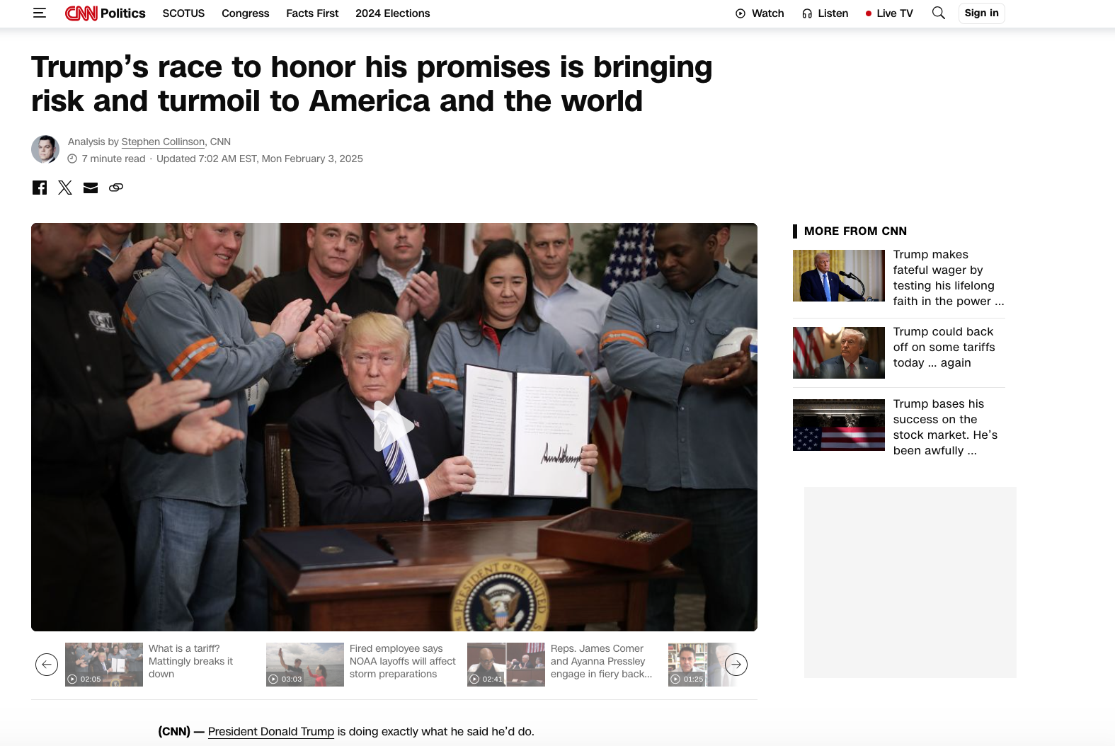 У статті « Прагнення Трампа виконати свої обіцянки несе ризик і заворушення в Америці та світі » видання прямо говорить: «Він [Трамп] починає жорсткі торговельні війни, щоб догодити виборцям, маргіналізованим глобалізованою економікою... І президент за допомогою Ілона Маска починає потрошити уряд, який його прихильники звинувачують у своїх проблемах.