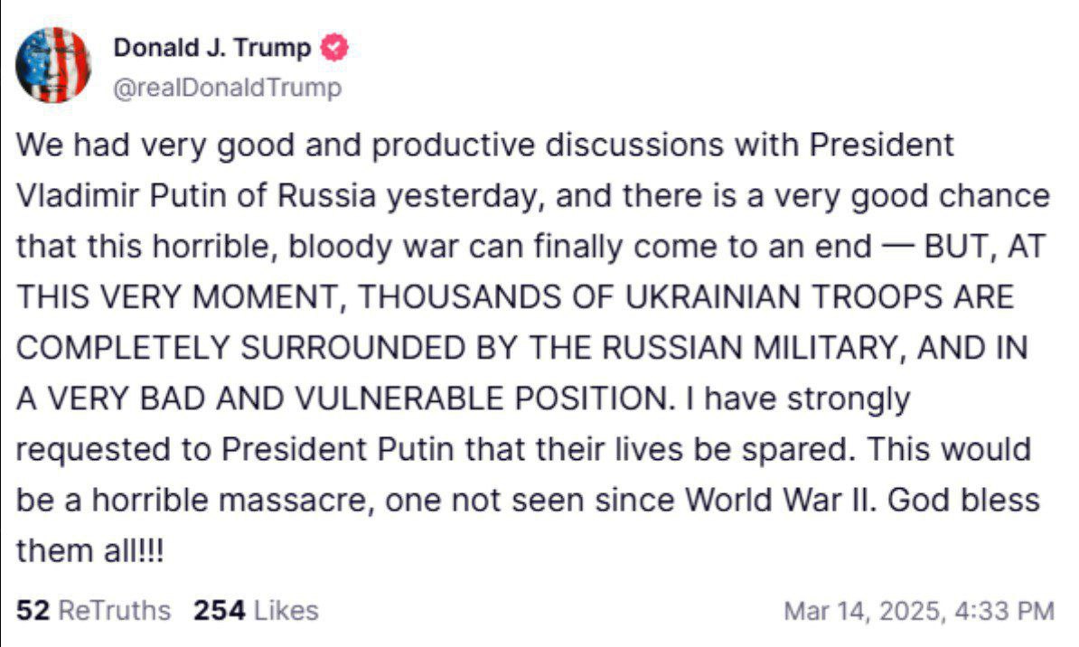 Трамп написав, що розмова відбулася 13 березня і є «хороший шанс, що ця кривава війна нарешті може закінчитися». Він також заявив, що просив Путіна зберегти життя "тисячам" українських військових, які «повністю в оточенні».