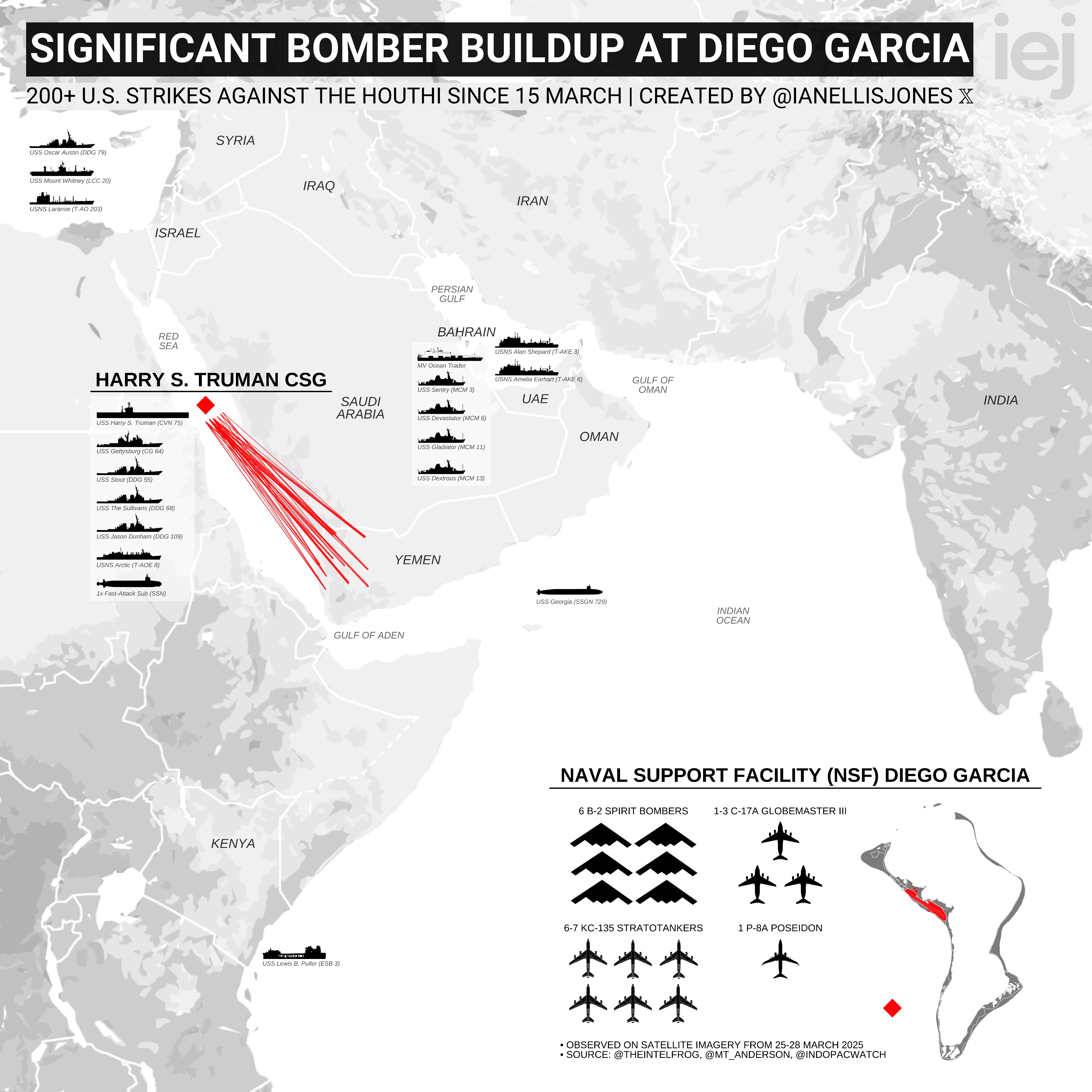 Видання Ian Ellis оприлюднило схему, де видно кораблі та літаки США, зосереджені навколо Ірану. На ній видно 15 військових кораблів різних типів та 16 бомбардувальників, які можуть вдарити по цій країні.