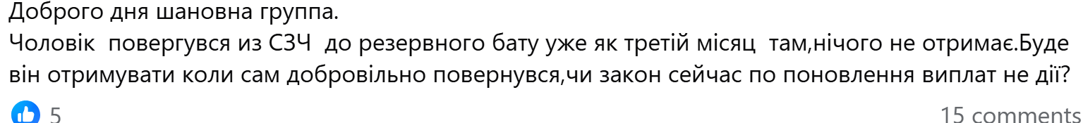 «Чоловік три місяці у резервному батальоні після СЗЧ, а жодних виплат не отримав, тільки годують» ,- такі скарги також можна зустріти у групах консультантів з військових питань. Йдеться як про місяці, так і про період у пів року перебування в резервному батальйоні, якщо на колишнього «самовільника» не знаходиться «покупець». Деякі юристи кажуть, що все вірно, бо поновлення у виплатах відбувається з дня зарахування до складу військової частини. Назар Олексюк спростовує це твердження.