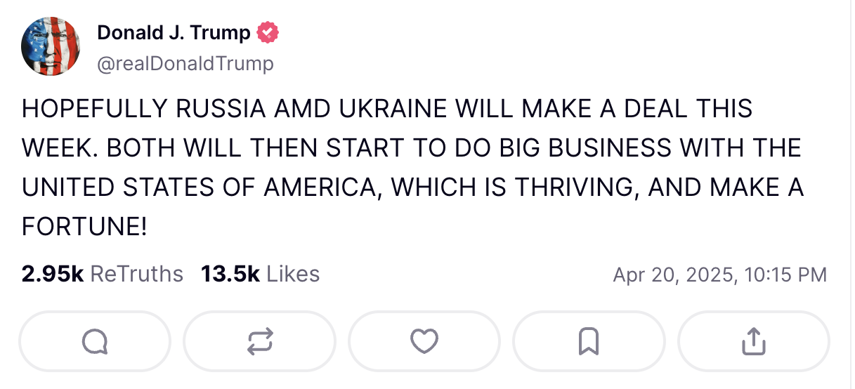 - Сподіваюся, цього тижня Росія та Україна укладуть угоду. Після цього обидві сторони почнуть вести великий бізнес з процвітаючими США і зароблятимуть статки! - написав він.