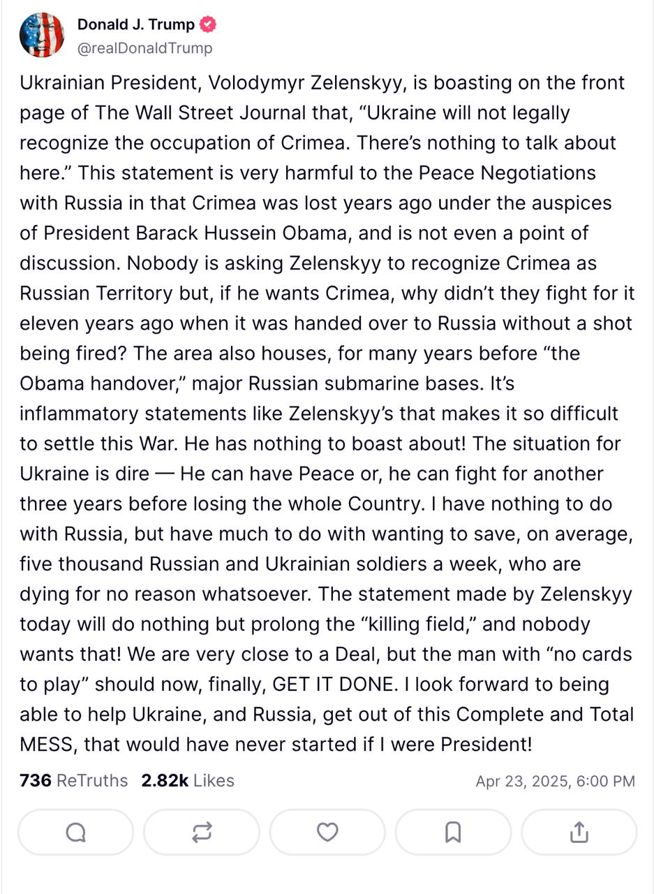 - Президент України Володимир Зеленський на першій шпальті The Wall Street Journal хвалиться, що "Україна юридично не визнає окупацію Криму. Тут немає про що говорити". Ця заява дуже шкідлива для мирних переговорів з Росією, оскільки Крим був втрачений багато років тому під егідою президента Барака Хусейна Обами й навіть не є предметом обговорення. Ніхто не просить Зеленського визнати Крим російською територією, але якщо він хоче Крим, то чому за нього не боролися одинадцять років тому, коли він був переданий Росії без жодного пострілу? - зазначив американський президент.