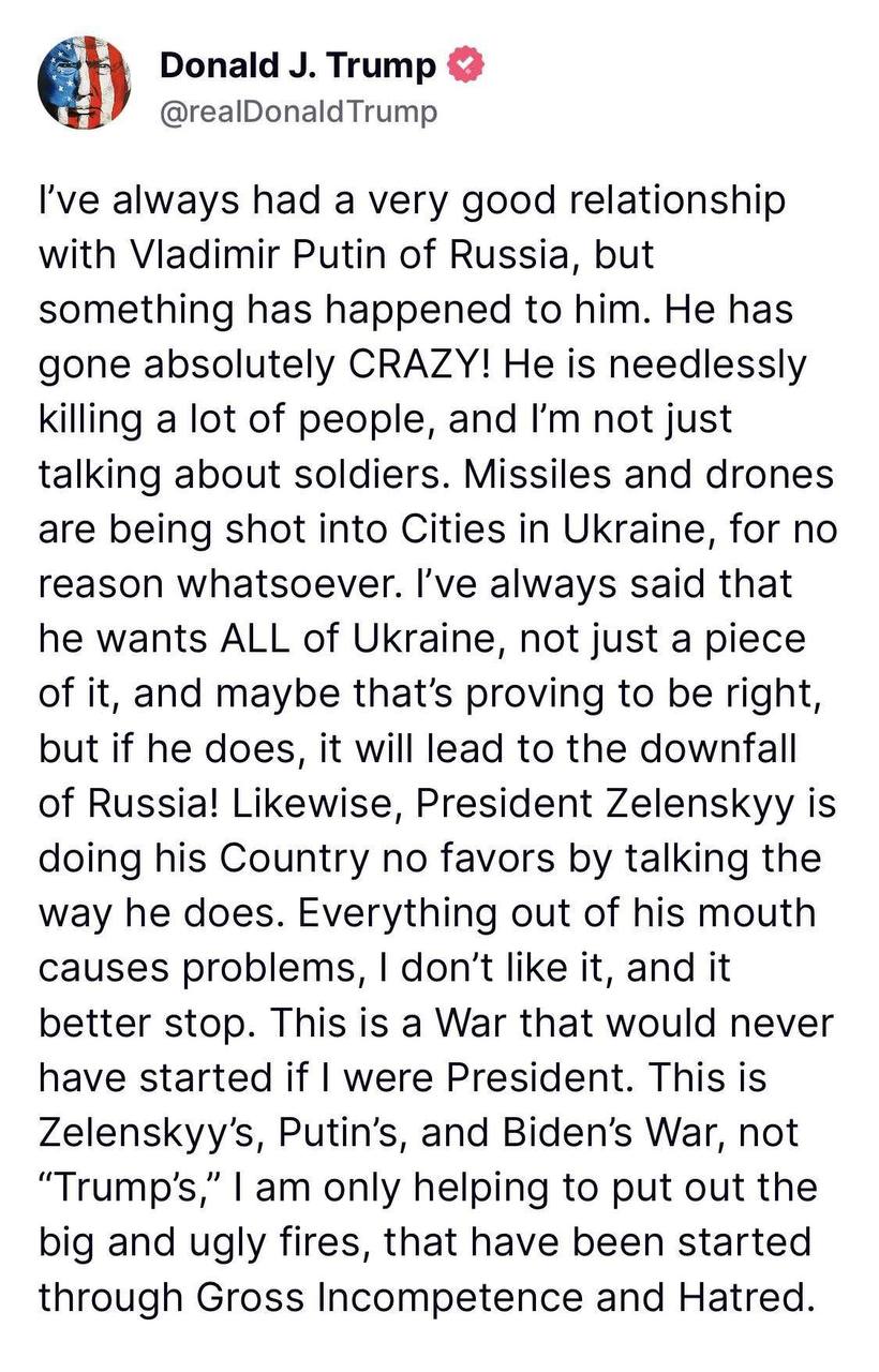 - У мене завжди були дуже хороші стосунки з Володимиром Путіним із Росії, але з ним щось сталося. Він став абсолютно божевільним! Він без потреби вбиває безліч людей, і я говорю не тільки про солдатів. Ракети і безпілотники запускають по містах в Україні без жодної причини. Я завжди говорив, що він хоче отримати ВСЮ Україну, а не тільки її частину, і, можливо, це виявиться правдою, але якщо він це зробить, це призведе до краху Росії, - написав Трамп.