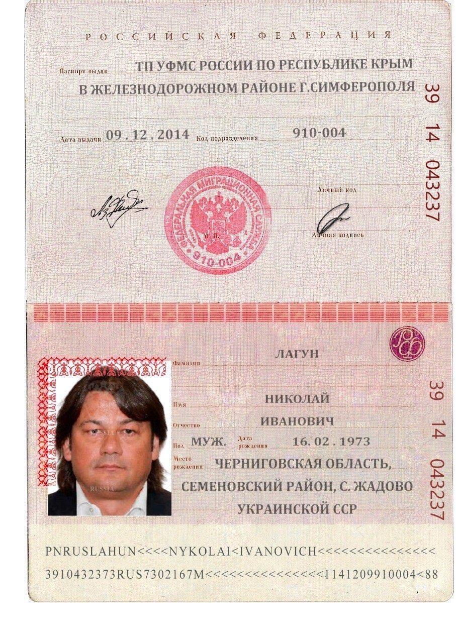 В розпорядженні редакції опинилась скан-копія російського паспорта Миколи Лагуна. Документ має серію 39 14, номер 043237, код підрозділу — 910-004. Згідно з кодами підрозділів МВС росії, це відповідає Управлінню Федеральної міграційної служби у Залізничному районі Сімферополя, яке було сформоване після окупації для «документування» нових «громадян». Це означає, що на момент видачі Лагун мав не лише доступ до інфраструктури російської міграційної системи в Криму, але й обізнаність щодо того, як скористатися її можливостями. Уважний читач підмітить, що серія 39 не має офіційної розшифровки в переліку регіонів. Справа в тому, що паспорти з такими серіями можуть видаватися в будь-якому регіоні, коли закічуються бланки з “місцевими” серіями.
