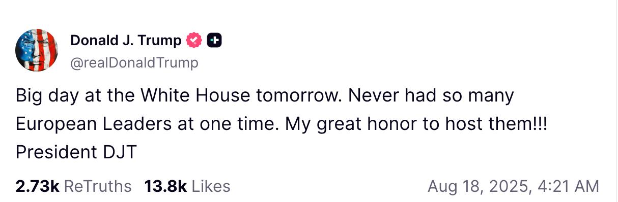 - Великий день у Білому домі завтра. Ще ніколи не було стільки європейських лідерів одночасно. Для мене велика честь приймати їх!!! - йдеться у дописі Трампа.