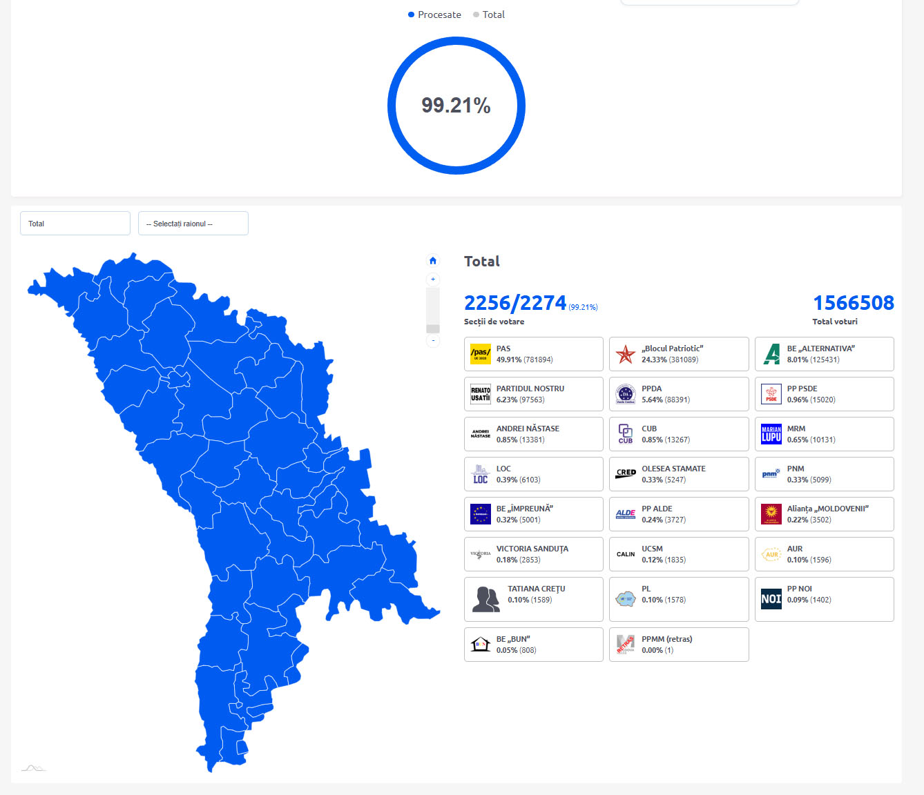 У Молдові, де 28 вересня відбулися парламентські вибори, підраховано вже 99,21% бюлетенів. За офіційними даними ЦВК, лідирує керівна Партія дії та солідарності (PAS), яку очолює президентка Майя Санду. Вона отримала 49,91% голосів виборців (718 494 бюлетені).