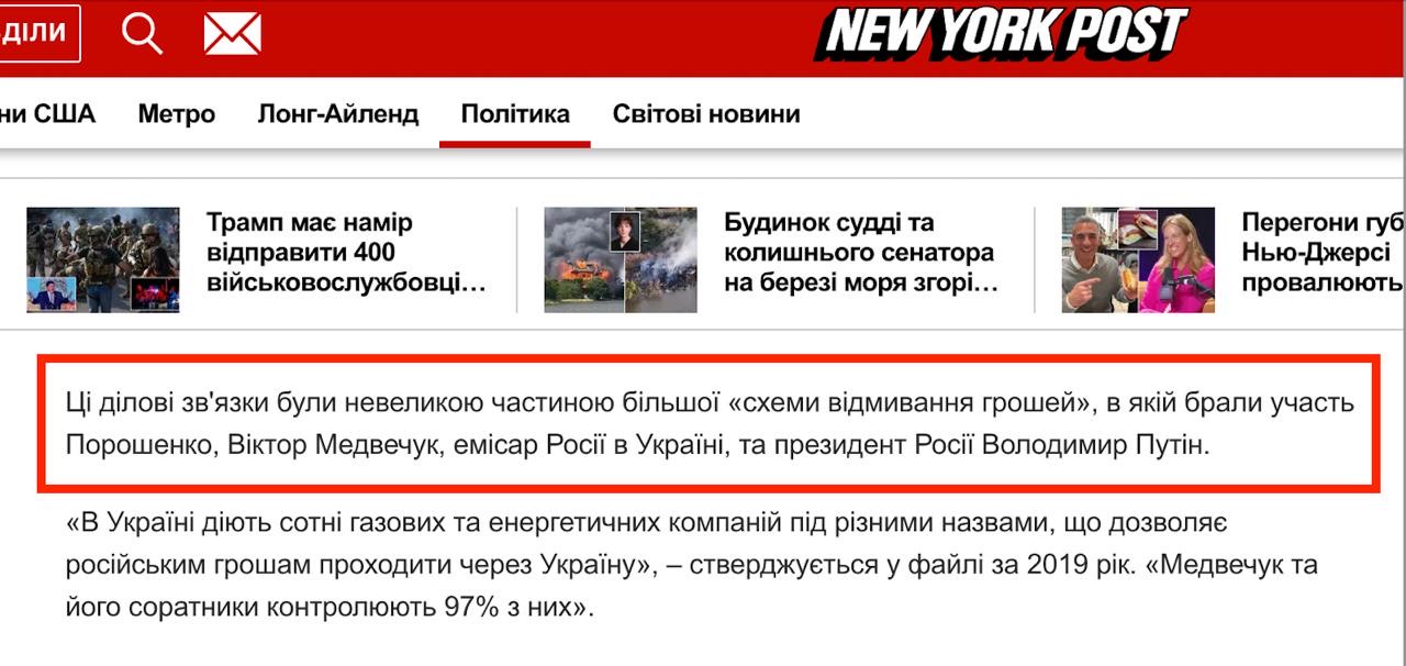 «Ці ділові зв'язки були невеликою частиною більшої “схеми відмивання грошей”, в якій брали участь Порошенко, Віктор Медведчук, емісар Росії в Україні, та президент Росії Володимир Путін. В Україні діють сотні газових та енергетичних компаній під різними назвами, що дозволяє російським грошам проходити через Україну», – цитує New York Post файли ФБР за 2019 рік.