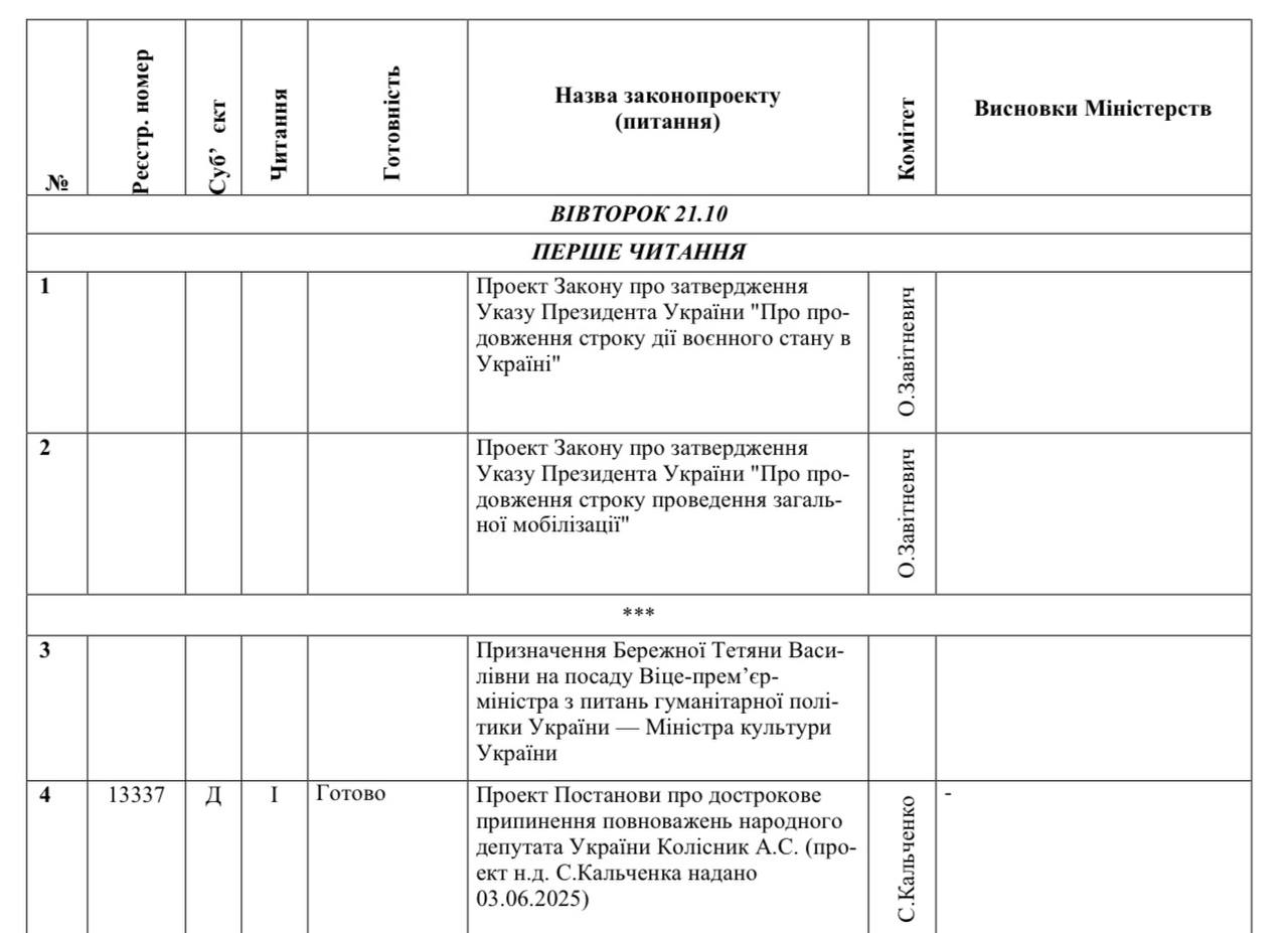 Раніше 15 жовтня Железняк також повідомив, що 21-22 жовтня на голосування мають винести призначення Тетяни Бережної на посаду віцепрем’єра з питань гуманітарної політики — міністра культури України.