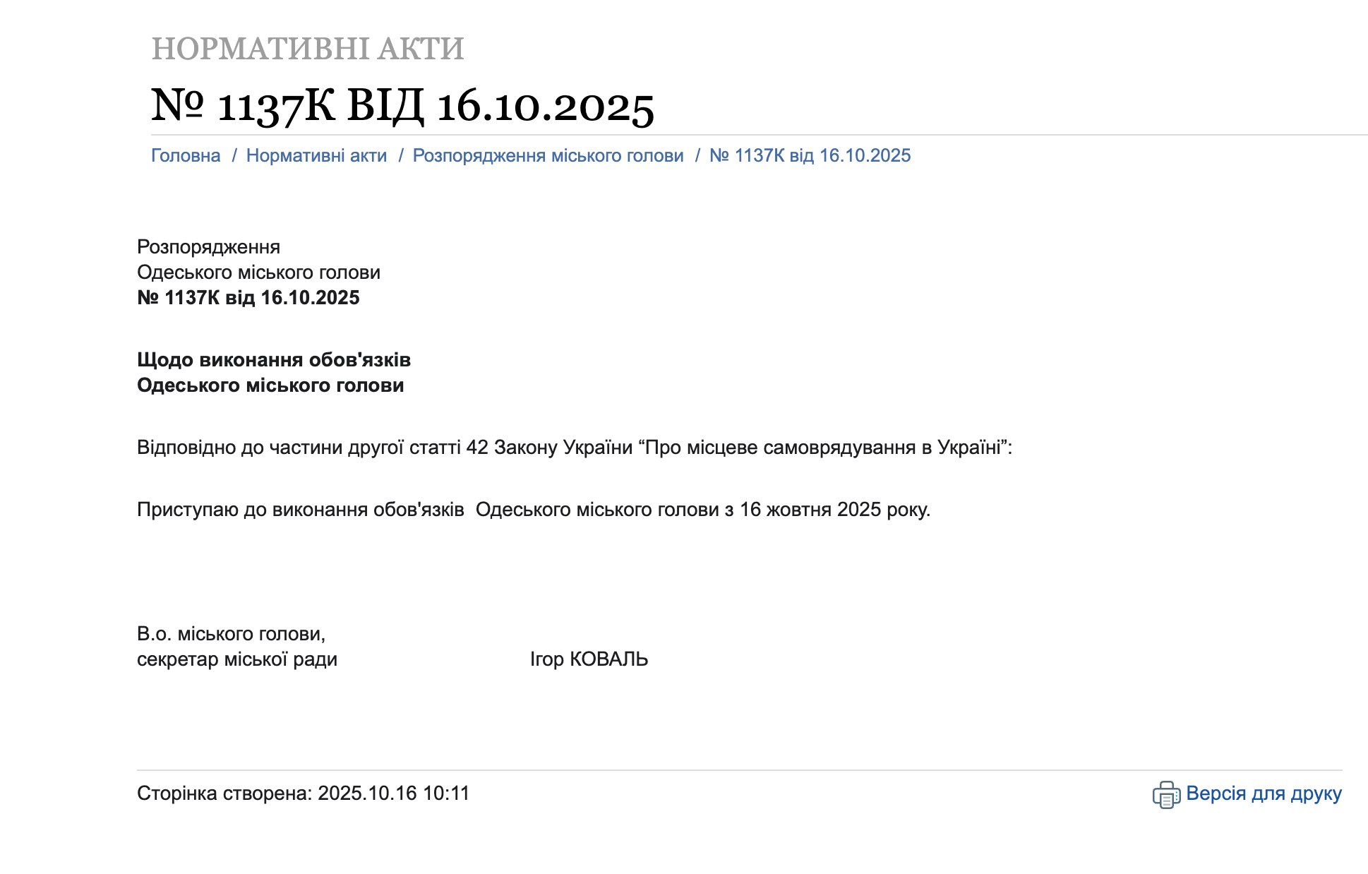 - Згідно з частиною другою статті 42 Закону України «Про місцеве самоврядування в Україні», приступаю до виконання обов'язків одеського міського голови з 16 жовтня 2025 року, — йдеться у документі.