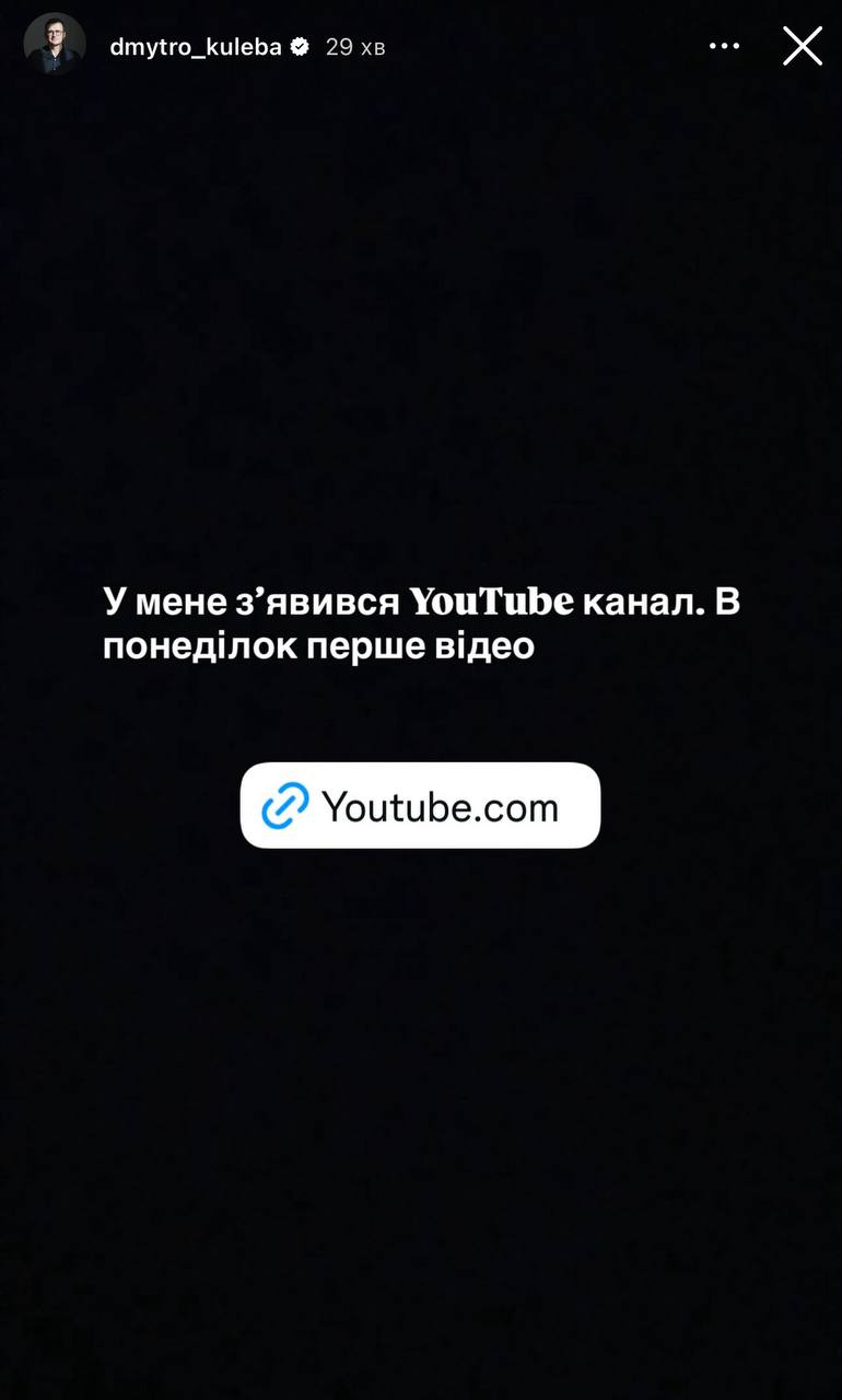 Колишній міністр закордонних справ України Дмитро Кулеба анонсував запуск власного YouTube-каналу. Перше відео на ньому з'явиться у понеділок. Про це дипломат повідомив у Instagram Stories.