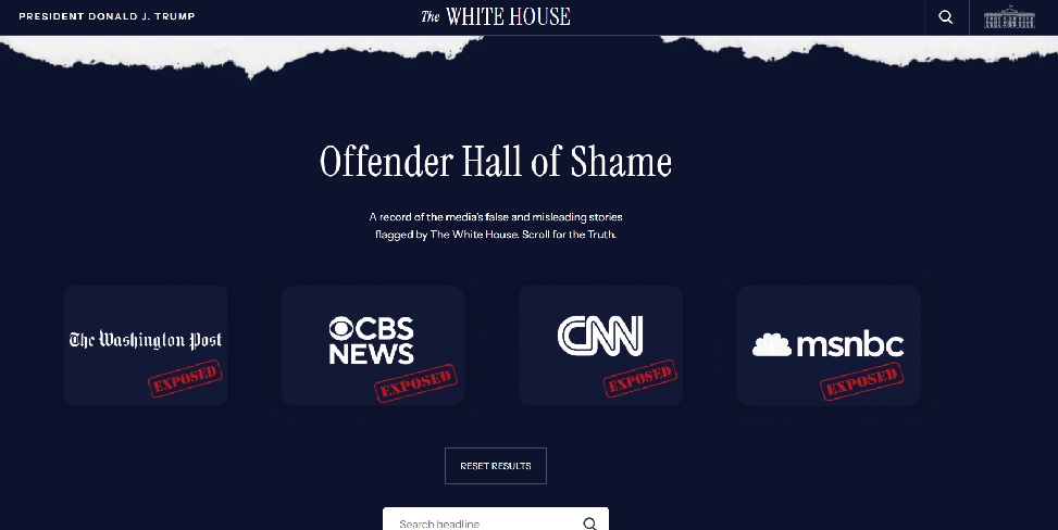 На офіційному сайті Білого дому з'явився новий розділ, присвячений мас-медіа, які нібито "упереджено" висвітлюють події. У цьому розділі розміщено список так званих "медіапорушників тижня" та виділено спеціальну "Зал ганьби".