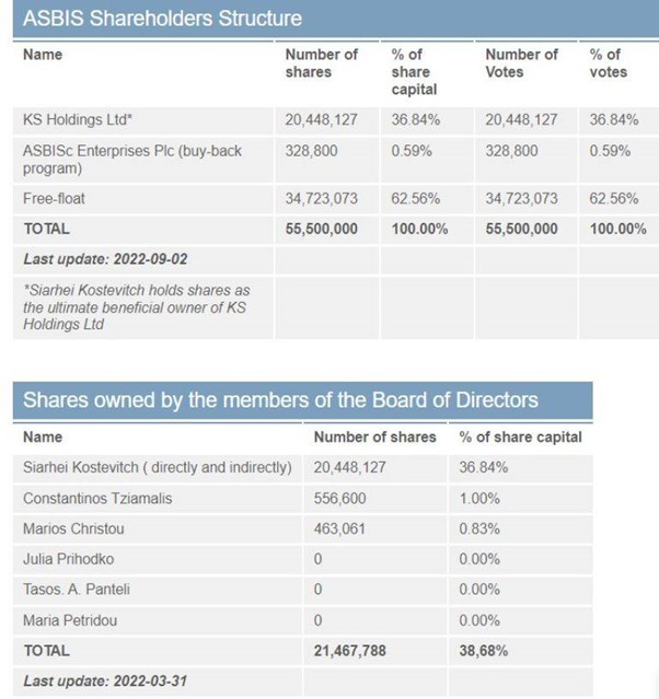 Сергій Костевич, народжений у Білорусі 1964 року, засновник і голова ASBISc Enterprises Plc, контролює понад третину акцій компанії.