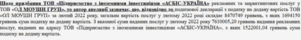 У цьому контексті у звітності «Асбіс-Україна» фіксується «придбання рекламно-маркетингових послуг» на понад 7 млн грн у Allmotion. Податкова декларація Allmotion за лютий 2022: 8,47 млн грн «наданих послуг» (ПДВ 1,69 млн), із яких 7,61 млн грн — платник «ПІІ „Асбіс-Україна“» (у т. ч. ПДВ 1,52 млн).