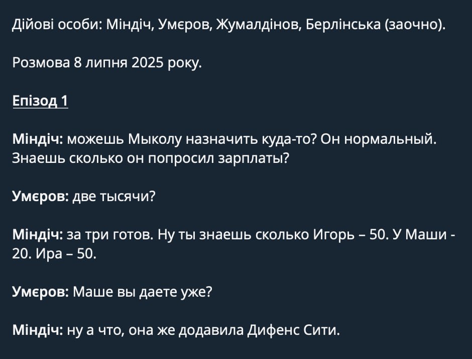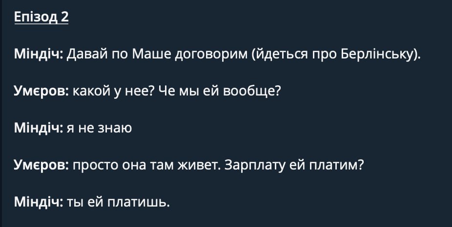 У діалозі Міндіч нібито наполягає на тому, щоб Умєров забезпечив виплати Берлінській. На запитання «Зарплату їй платимо?» Міндіч відповідає ствердно, згадуючи суму «20» (ймовірно, тисяч доларів). Окрім фінансових питань у розшифровках йдеться про спроби впливу на процеси закупівлі бронежилетів для Сил оборони.
