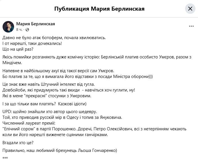 - І от нарешті, таки дочекались! Що на цей раз? Якісь помийки розганяють дуже комічну історію: Берлінській платив особисто Умєров, разом з Міндічем. Напевне в найбільшому а**ї від такої версії сам Умєров, - пише Берлінська. - Бо платив за те, що я вимагала його відставки з посади Міністра оборони.