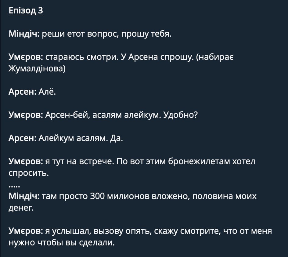 Оприлюднені записи нібито датуються липнем 2025 року. У записах людина з голосом, схожим на голос Міндіча, обговорює з тодішнім міністром оборони Рустемом Умєровим та головою Агенції оборонних закупівель Арсеном Жумаділовим виплати для Берлінської.