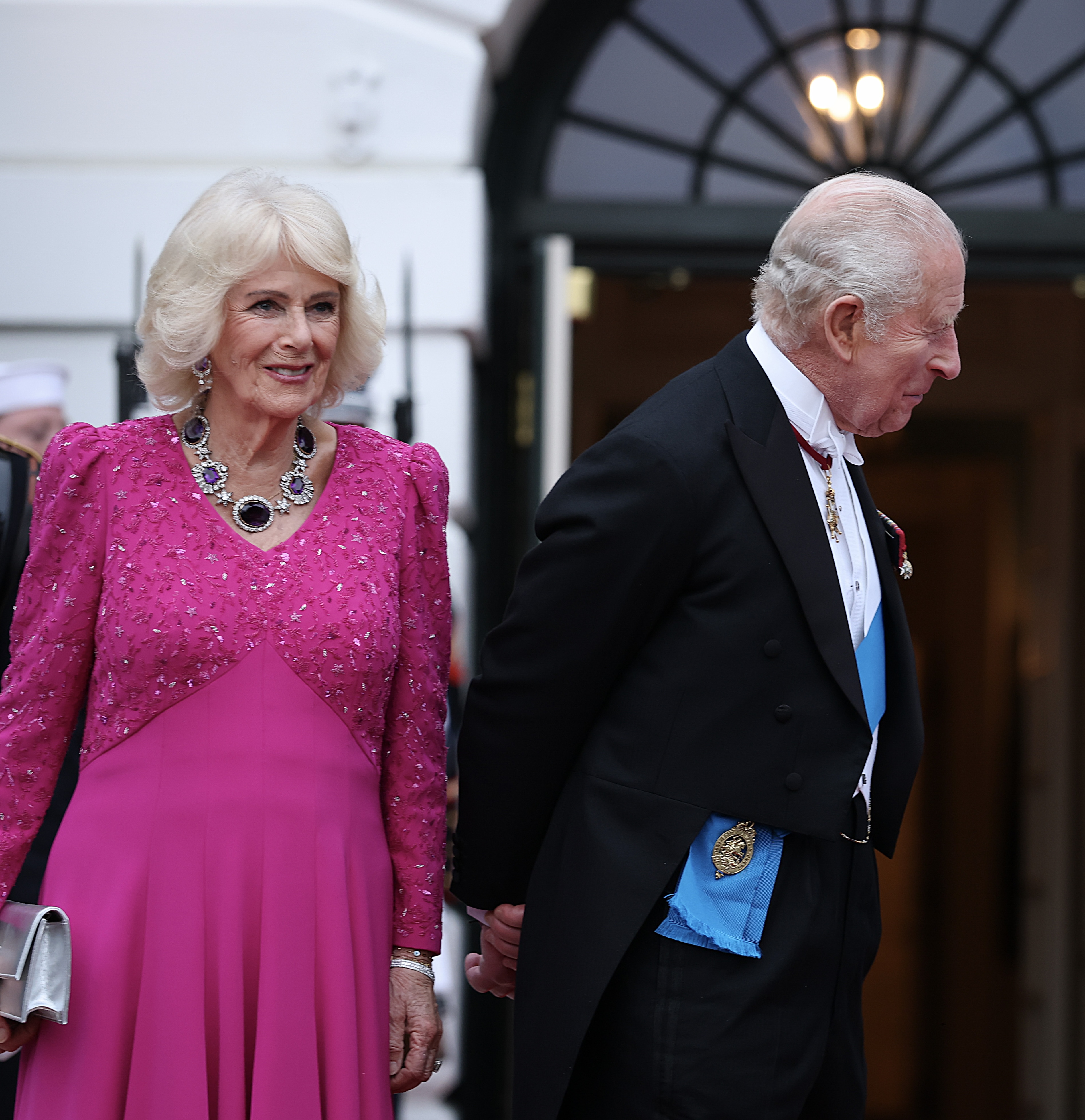 Королева Камілла обрала яскраво-рожеву сукню від свого улюбленого британського модельєра Фіони Клер. Шию прикрашало аметистове та діамантове кольє, подароване колишньою герцогинею Кентською королеві Вікторії, а згодом передане королеві Марії.