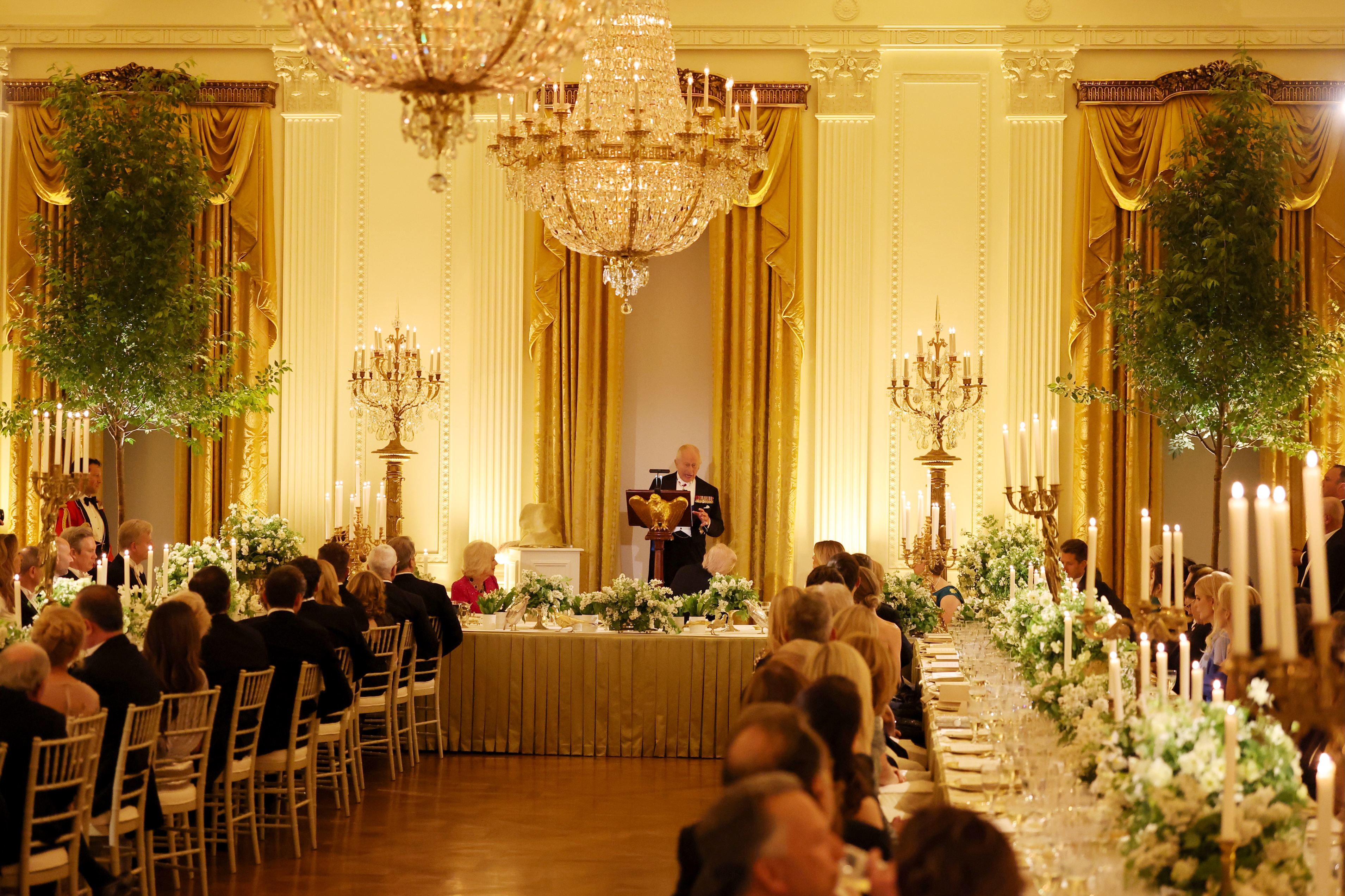 Столи накрили зеленими скатертинами й оздобили сезонними весняними букетами з ранункулюсів, флоксів і конвалій. Сервірування включало понад 250 предметів позолоченого срібла із колекції Білого дому, а також вручну розписані меню.