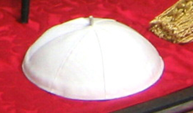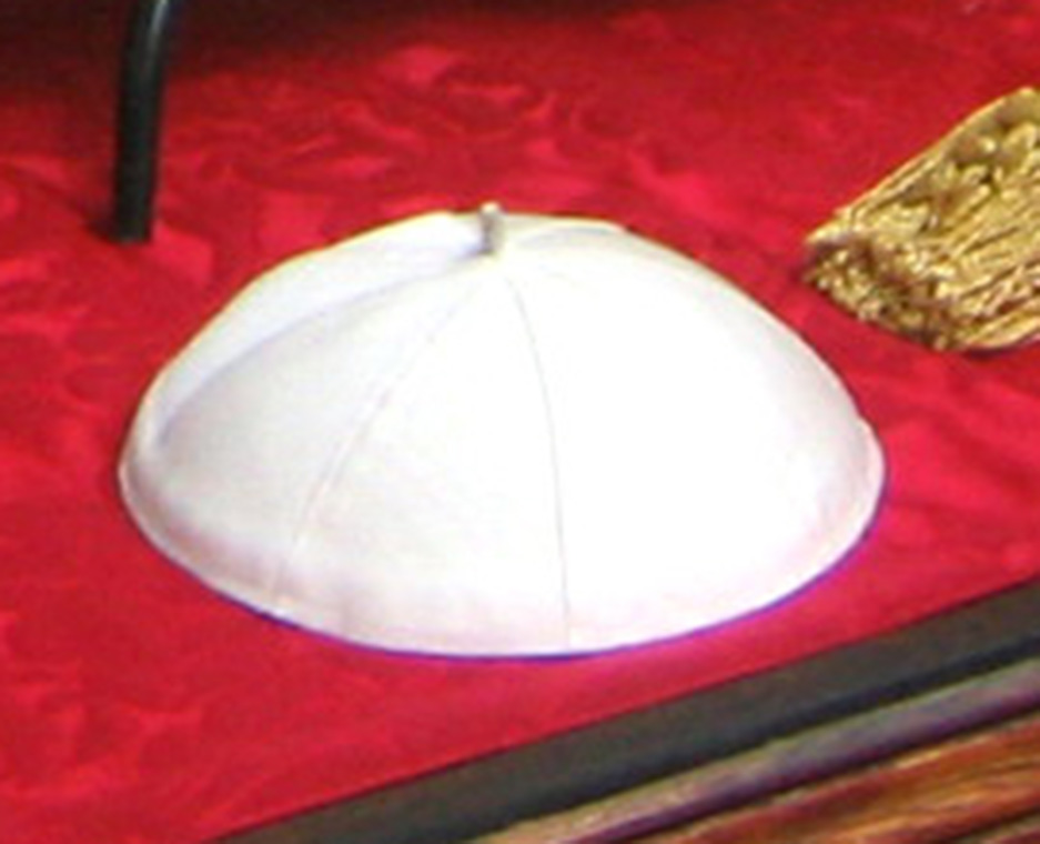На голові у Папи - череп'я (Zucchetto), маленька кругла шапочка. Папська череп'я - біла на відміну від червоної кардинальської чи фіолетової єпископської. Біла череп'я символізує духовну владу та чистоту помислів. Вона також пов'язана із традицією покриття голови на знак поваги до Бога. У Папи Івана Павла II після обрання 1978 року розмір голови виявився нестандартним, і кравцю довелося спішно підганяти череп'ю.