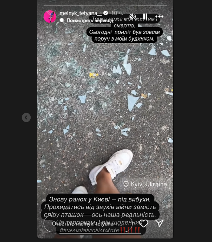 - Тонка межа між життям і смертю. Сьогодні приліт був зовсім поруч із моїм будинком. Знову ранок у Києві під вибухи. Прокидатися від звуків війни замість співу птахів – ось наша реальність. Це тероризм, і він щоденний, – написала Тетяна Мельник.