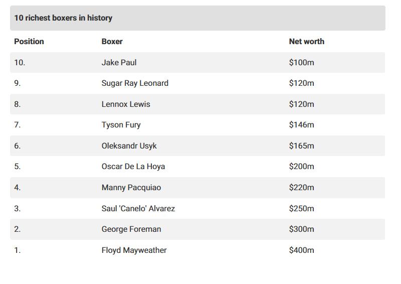 Найбагатшим боксером у світі залишається Флойд Мейвезер-молодший із капіталом у 400 млн доларів.